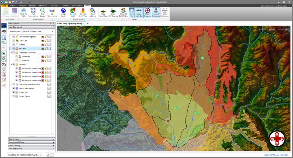 Utilisation de données numériques d'élévation en 3D à haute résolution provenant de services cartographiques pour la délimitation automatisée des bassins versants, le calcul du temps de concentration et du temps de latence. Utiliser les services de cartographie en ligne pour les orthophotos aériennes, les cartes d'inondation de la FEMA, la délimitation des bassins versants, l'alignement des axes fluviaux, etc.